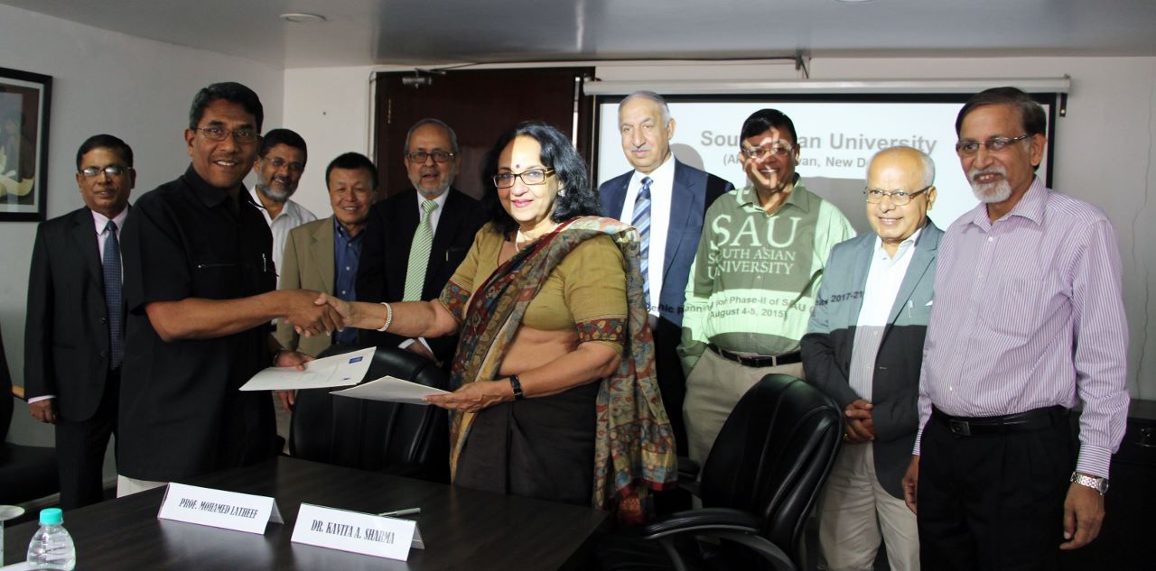 Dr. Kavita Sharma, President - SAU & Prof. Mohamed Latheef, Chancellor - The Maldives National University signing an MoU, in the presence of members of the SAU Second Phase Academic Task Force in New Delhi